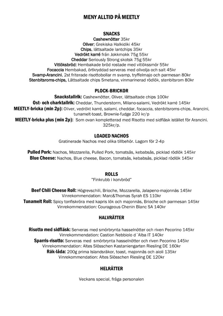 I våra kök lagas ärlig, okomplicerad mat utgående från bästa tänkbara råvaror från lokala leverantörer. Att matcha maten mot olika drycker, främst vin, är det vi brinner allra mest för, så prova gärna våra olika dryck- och matkombinationer; Wine-dining, Avsmakningsmeny, Sharingmeny eller Meetlybricka